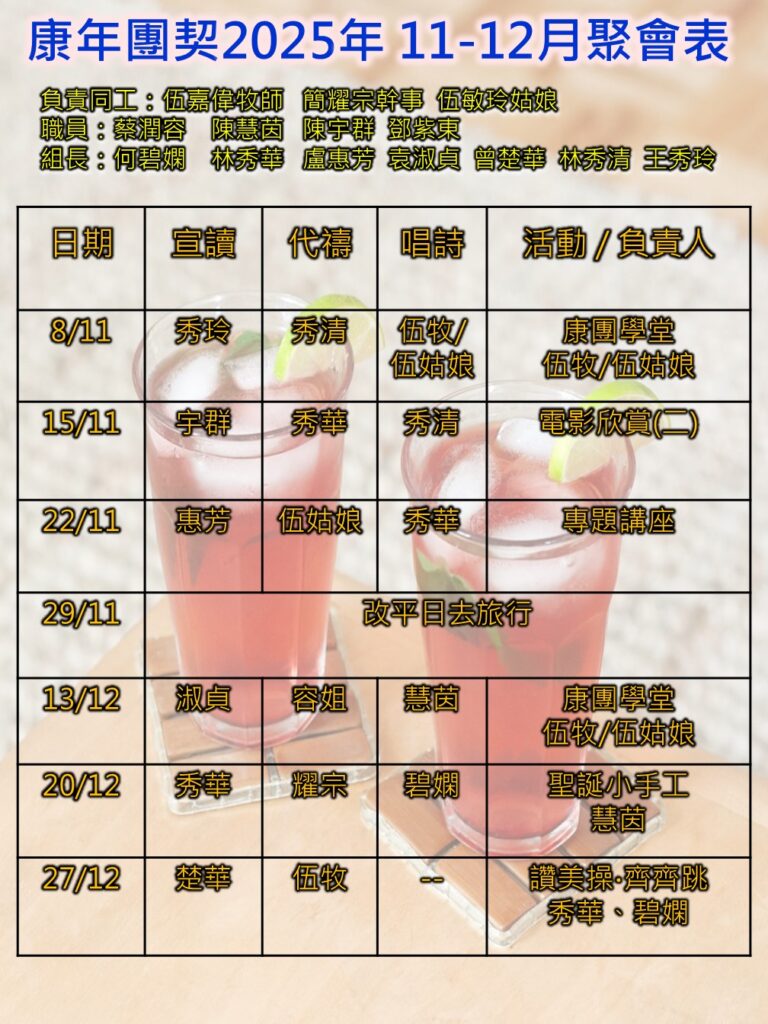 遊戲活動及分享代禱等,讓參加者活得更多采多姿。